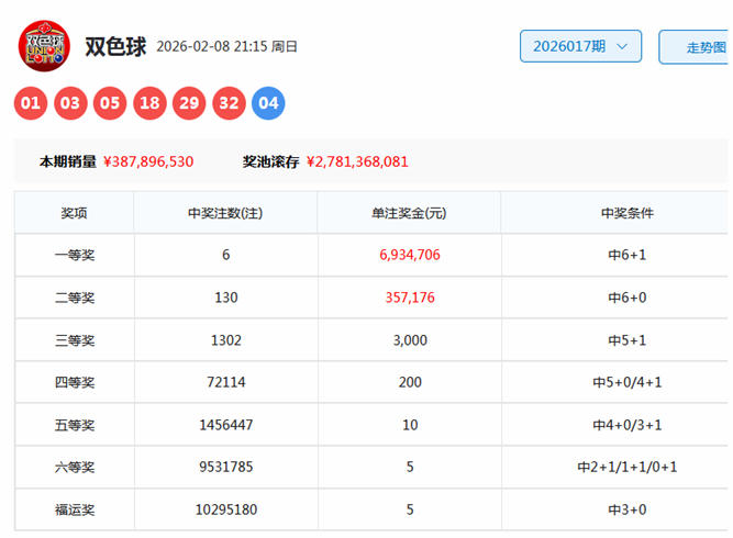 开奖回顾:双色球第2026017期奖号为:01 03 05 18 29 32 + 04,其中红球号码奇偶比为4:2,大小比为3:3,012路比为2:1:3,三区比为3:1:2。