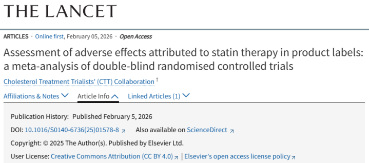 [1] Reith C, et al. Assessment of adverse effects attributed to statin therapy in product labels: a meta-analysis of double-blind randomised controlled trials. The Lancet. Published online February 5, 2025. DOI: 10.1016/S0140-6736(25)01578-8
